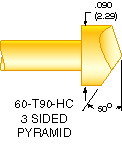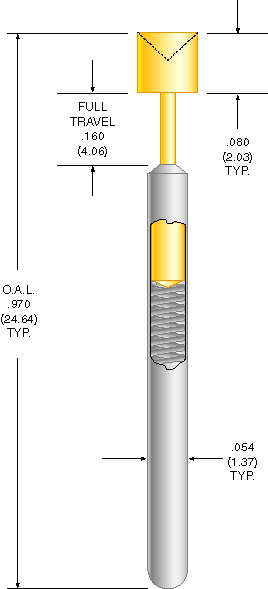 | Probe Technical Data Mechanical MINIMUM CENTERS: .100 (2.54) FULL TRAVEL: .160 (4.06) WORKING TRAVEL: .107 (2.72) Electrical MAXIMUM CURRENT: 8-10 amps at working travel, non-inductive RESISTANCE: At 35 mA test current 60 18 mOHMS mean Materials and Finishes PLUNGER: Heat treated beryllium copper 24 Kt gold plated over nickel BARREL: Nickel silver with silver plated ID and OD over nickel SPRING: Music Wire, silver plated over nickel |