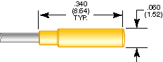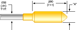 These pins have a retaining dimple that keeps the pins from falling out of the fixture, (see illustration). They are capable of testing SMD products on centers of: .050, .040, .025 and as low as .015 mil. They also allow testing of high density boards with the standard .100 mil. grid. it is possible to fan the pins up to .250 inches off center, and still maintain excellent contact. The use of a three plate system is recommended. Test Connections offers pins in four diameters and several different head styles to facilitate almost any application. Custom designs can also be supplied.